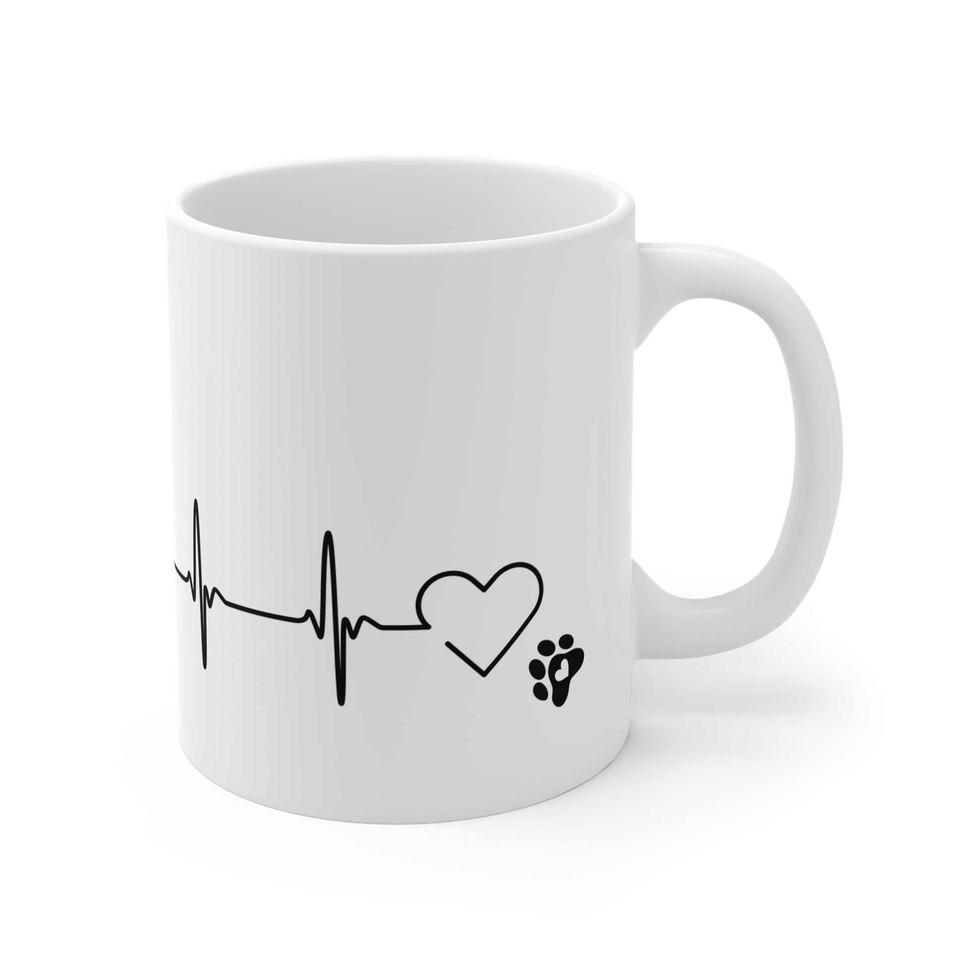 A simple white ceramic mug that speaks to anyone whose heartbeat quickens for dogs. The design wraps around in a single-line illustration: a heart, a steady heartbeat line, and a sitting dog — quiet, familiar, and full of companionship. It’s the kind of mug you reach for during slow mornings, vet-check routines, or while scrolling community forums about training tips. Lightweight to hold, easy to clean, and lively in print, it becomes part of everyday rituals — coffee, tea, or late-night cocoa — that celebrate the small, steady love of a canine friend.