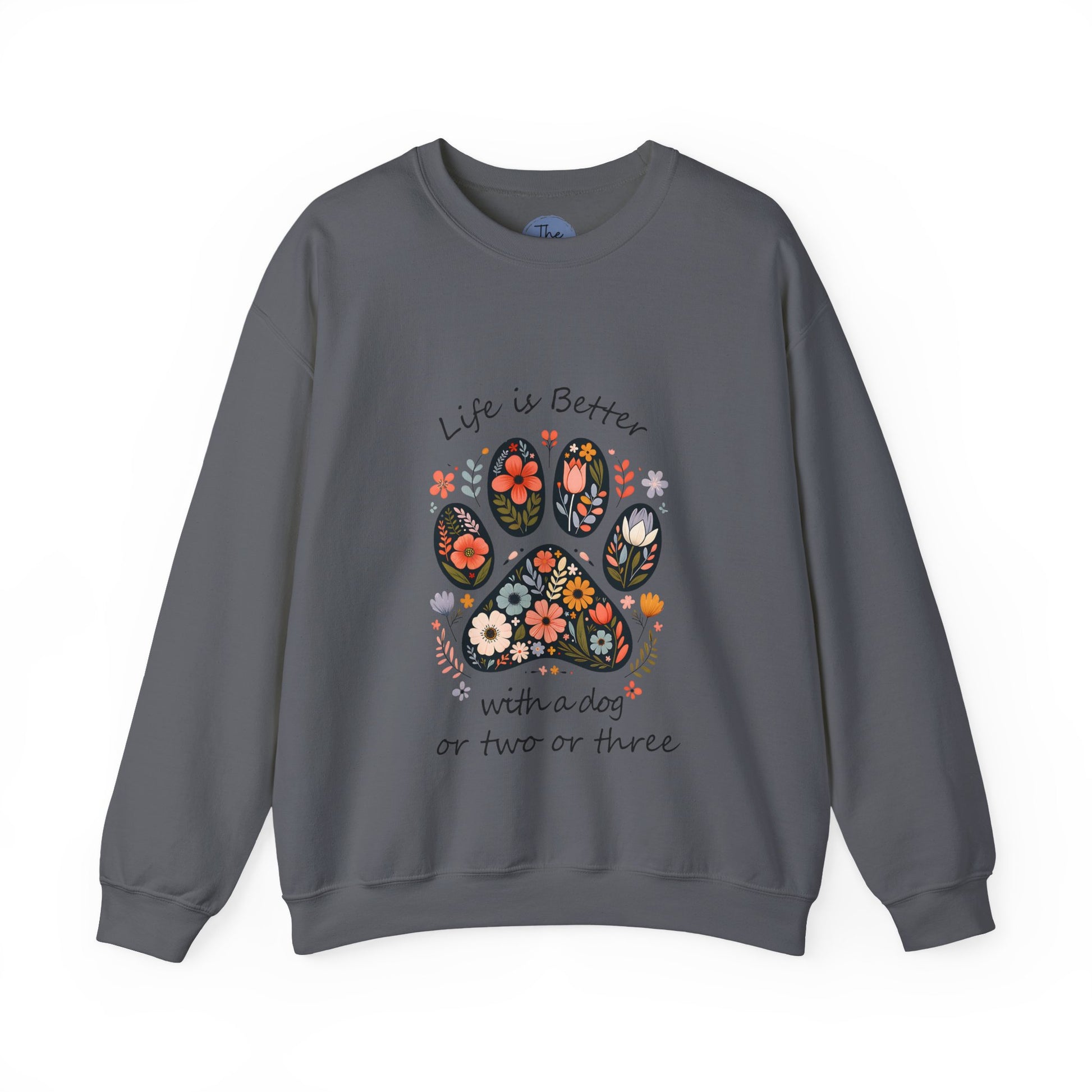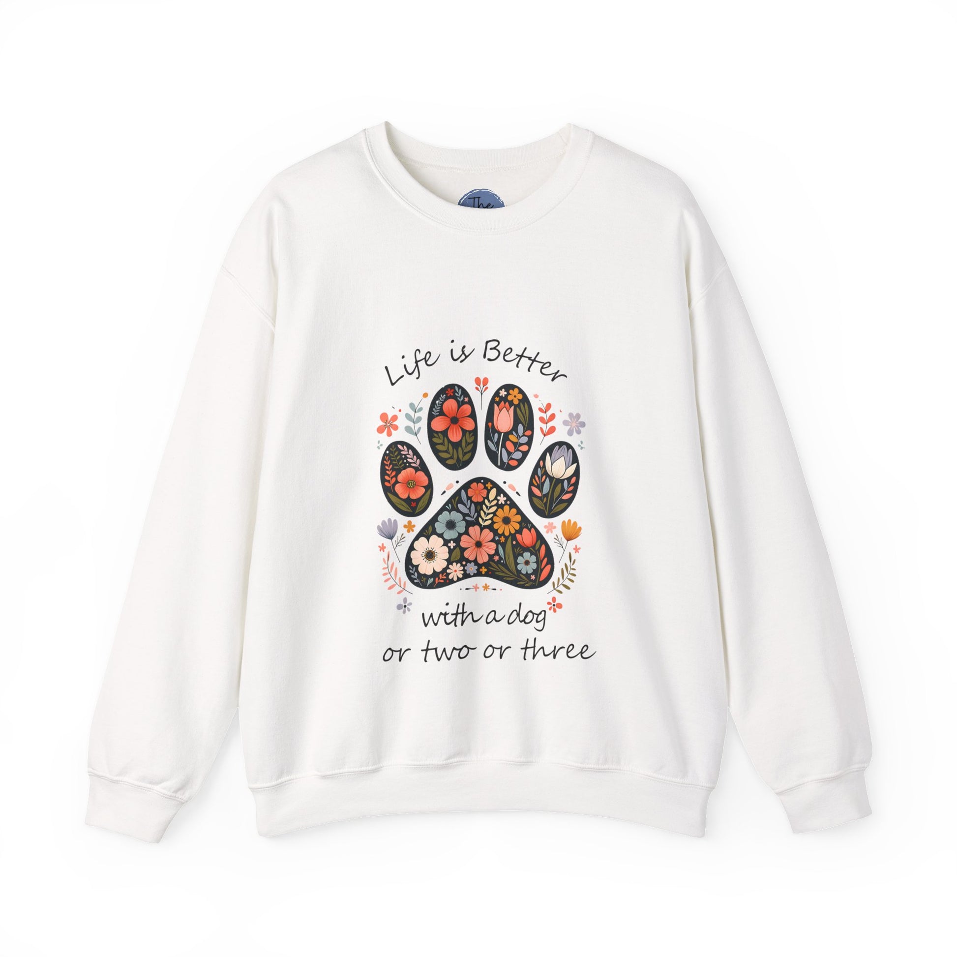 A cozy crewneck sweatshirt that reads like a warm pause in a busy day. Soft, medium-heavy cotton-blend fabric cushions you while a cheerful floral paw print sits at the chest, framed by the handwritten line “Life is Better with a dog or two or three.” It feels like a quiet morning with a furry friend at your feet — easy to throw on for neighborhood walks, coffee runs, or curling up on the couch. The clean white backdrop makes the colorful flower-filled paw pop, and the classic fit keeps the silhouette relaxed without looking sloppy. Durable double-needle stitching and a tag-free neck mean long wear and no itch; embroidery or prints can be placed where you prefer for a personalized touch. Ethically sourced cotton and OEKO-TEX-safe dyes make it a thoughtful everyday layer for dog lovers who value comfort, quality, and a little playful charm.