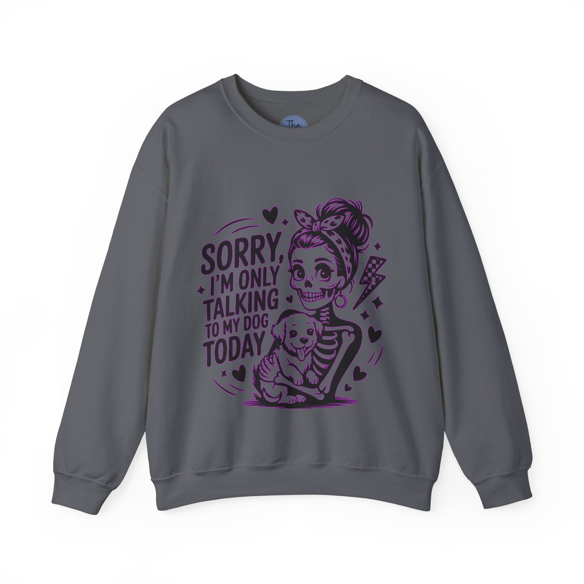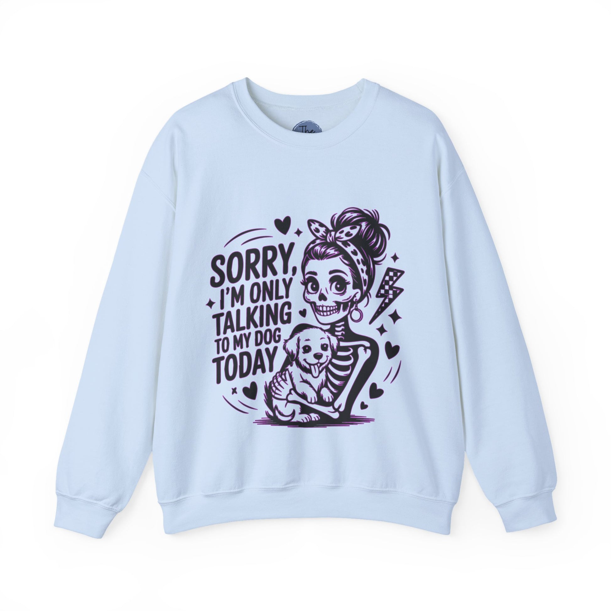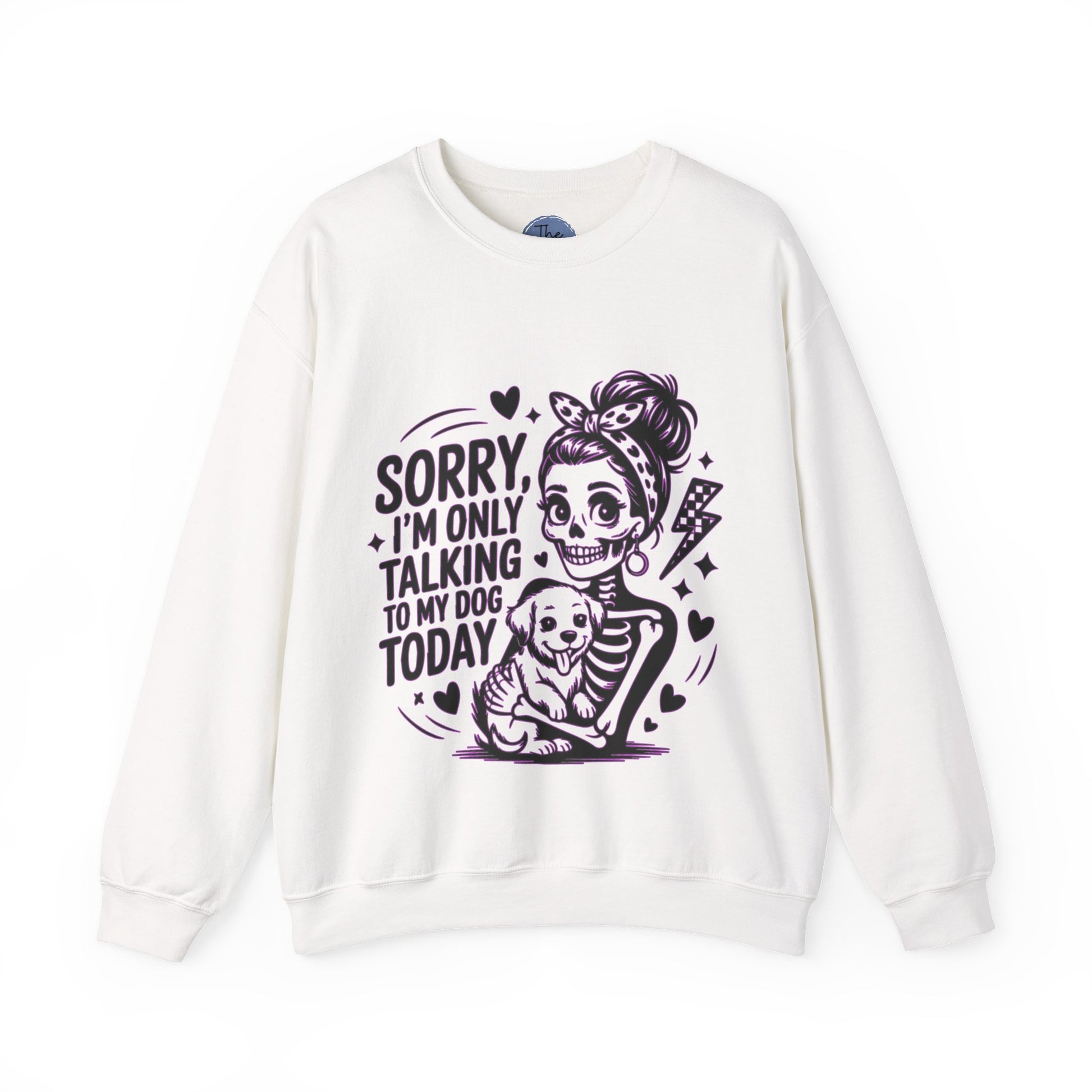 Soft, classic, and a little sassy — this crewneck speaks to anyone who lives for dog cuddles and honest mornings. The front art shows a playful, tattoo-inspired girl cradling a happy pup with the line “Sorry, I’m only talking to my dog today.” It reads like a wink to fellow pet lovers: cozy comfort that lets you step out (or stay in) with style and a clear agenda. Wear it on slow weekend walks, coffee runs where conversation can wait, or quiet nights on the couch with your dog curled at your feet. The neutral white keeps the illustration front-and-center, while the roomy cut and soft midweight blend make this sweatshirt feel lived-in from the first wear.